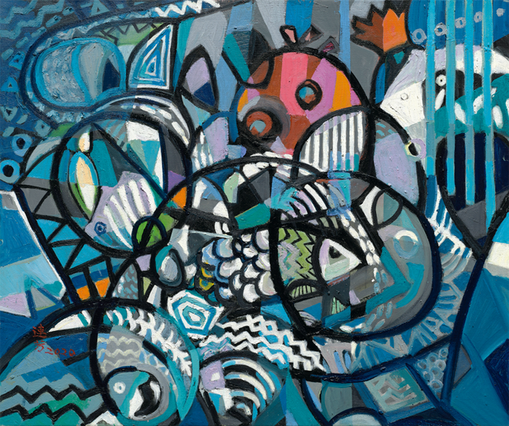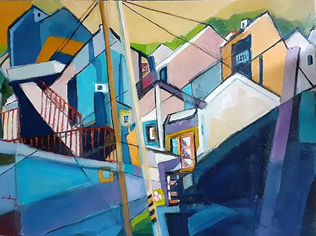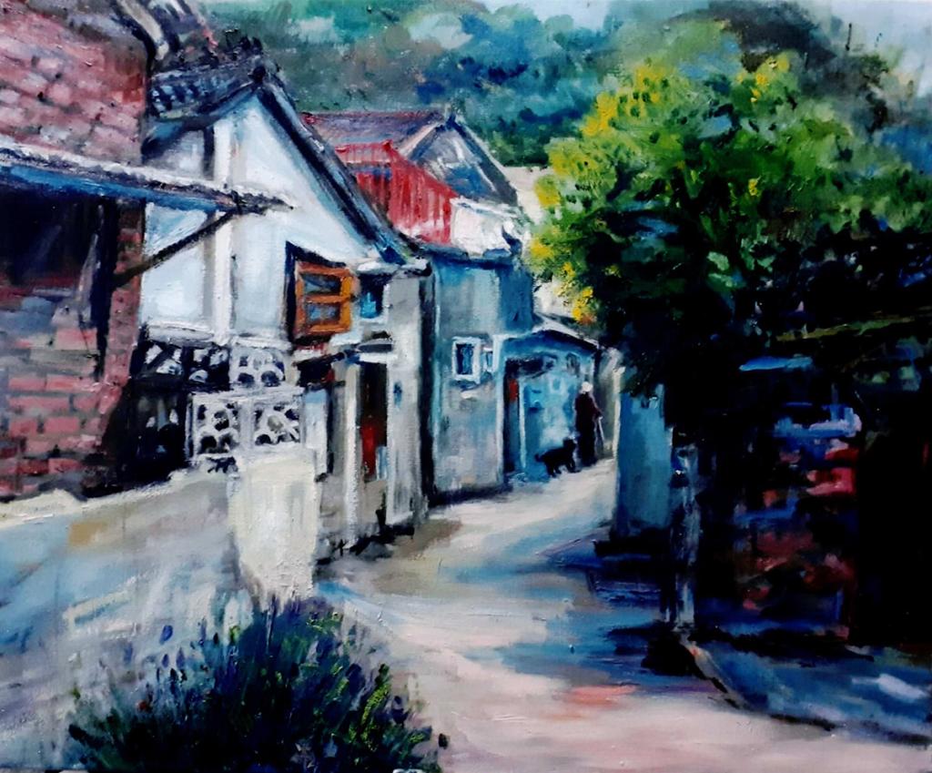 「中興莊從西側幼稚園看過來,整個山牆高高低低,大小不一,有加建的、有擴充的,錯落有致,但整個灰色調,有點憂鬱,歷經滄桑。利用幾何圖形簡化,抽象加上歡愉的色彩。」
