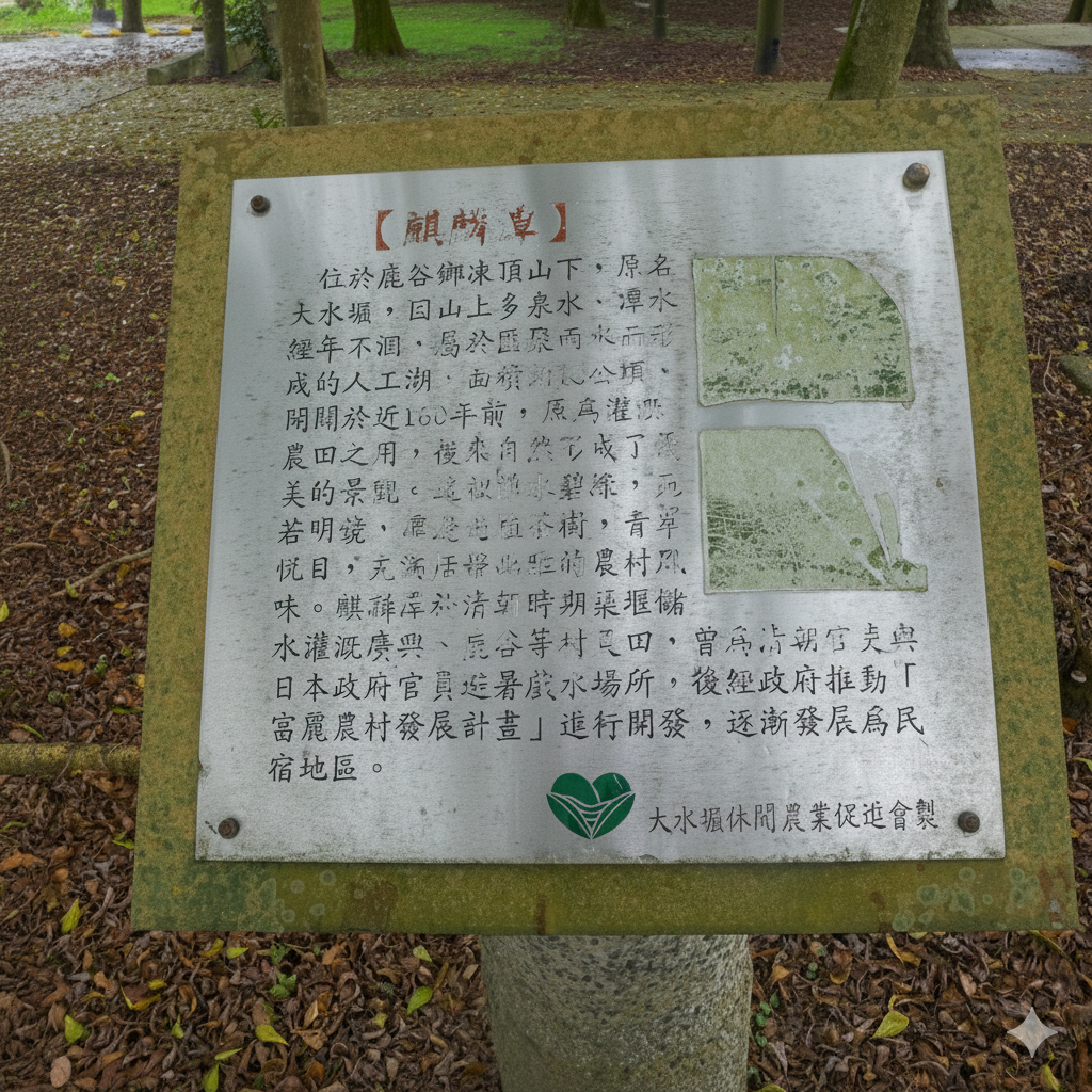 大水堀是麒麟潭的舊稱,原是鳳凰山、凍頂山和尖仔尾山三山環抱的大水池,清治時期地方居民築壩蓄水,水源供農田灌溉使用。逐漸擴大成為蓄水湖。大水堀的水源來自山上的泉水以及雨水。清治時期,《雲林縣採訪冊》曾記載: 「大水窟 亦名蓮花池;池中多產蓮花。在崠頂山之麓、鳳凰山之前,距縣四十五里。池周廣二、三里,四面屏鬟列翠,泉源甚盛;紅白蓮花浮擎水面,青筩綠蓋,布滿池中。傳聞昔時曾開金墘白蓮,鮮妍異常,香韻尤絕。池中魚族甚繁。採蓮取魚,必駕竹筏。每當春、夏良辰。崠峯倒影,輒見鴛鴦浮游巖際。風過香聞數里,為縣東名勝。」 1974年,蔣經國將其命名為麒麟潭。1999年九二一大地震後,麒麟潭獲重建會規劃進行茶文化園區建設,完成環潭步道。