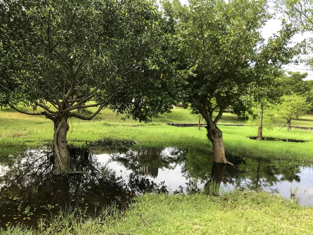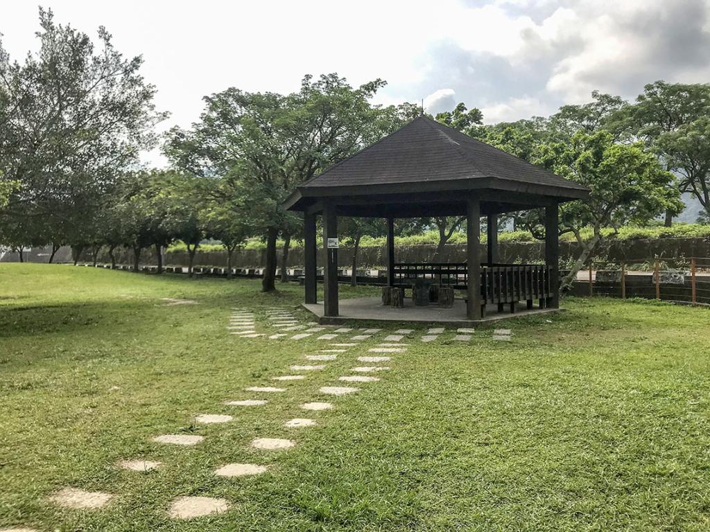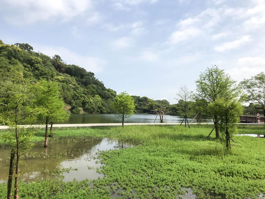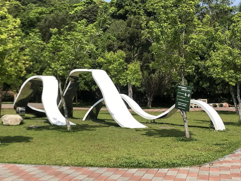此外,公園旁即為大漢溪堤坊,沿著石階登上河堤,可遠眺石門大壩與大漢溪的沿岸風光;公園的後方則連接知名的樟之細路。公園內有浪漫台三線的裝置藝術:年輪下、浮草庵、水琴窟,及客家茶港:挑擔細路、山水慢漫、集貨橋。盛夏時節一望無際的綠油油稻田;秋冬稻作收割後播種下後的大片的波斯菊花海,演繹出賞心悅目的花海嬌點。