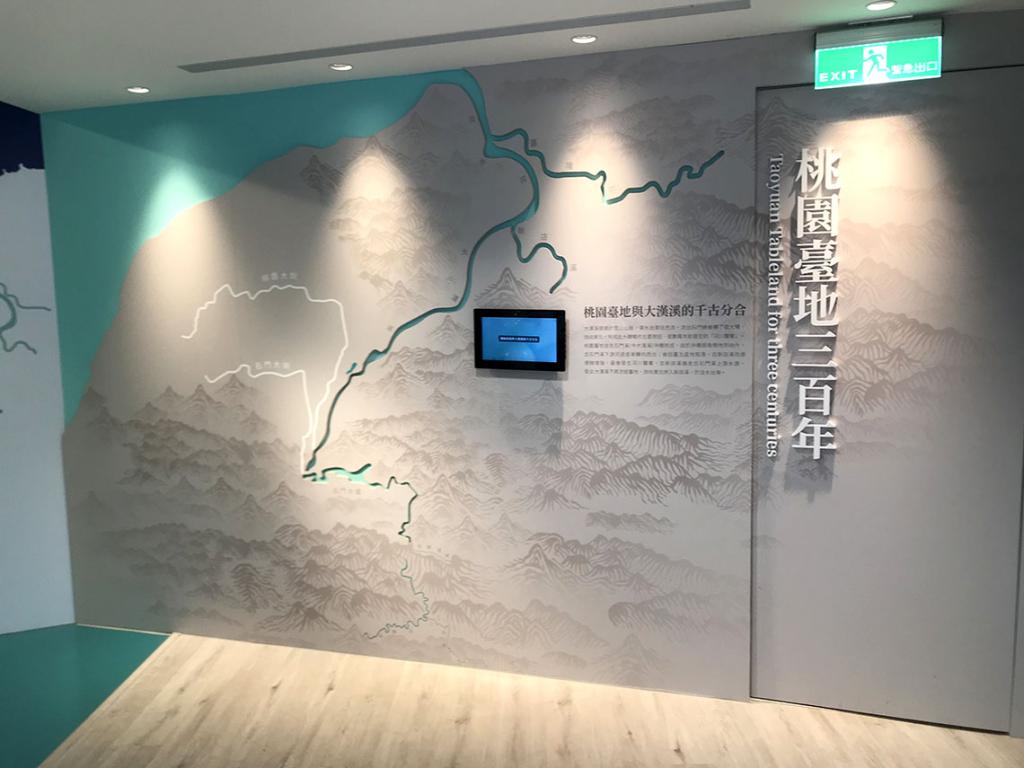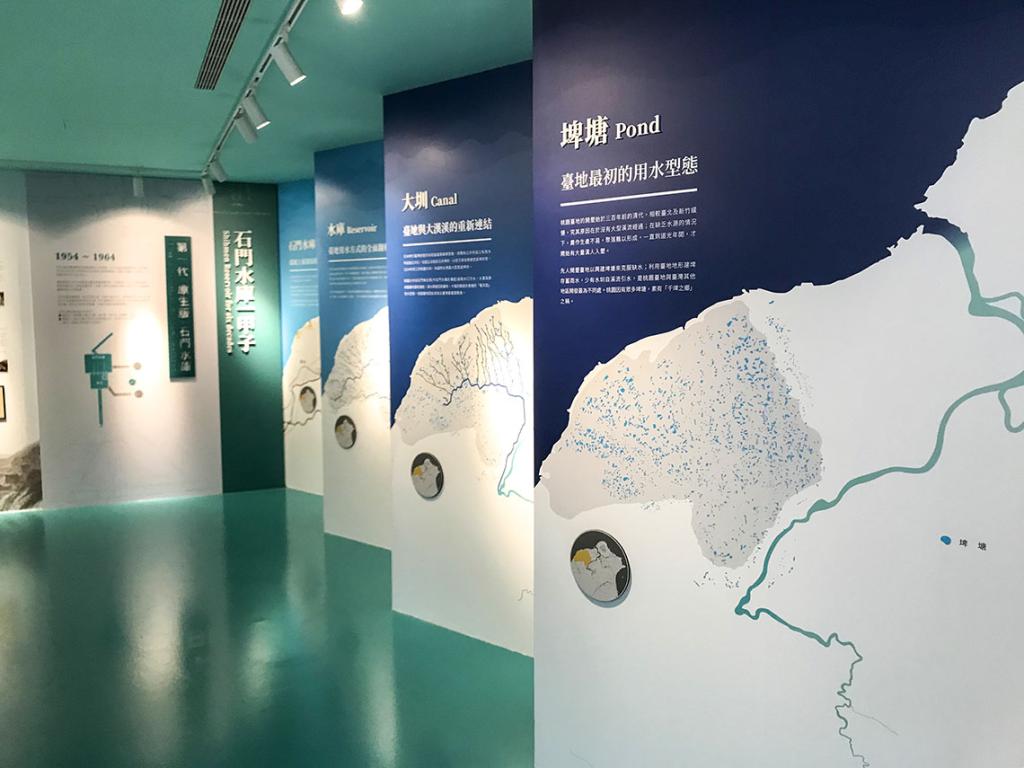 石門水文化館位於石門水庫依山閣的一樓,是一座以Tiffany Blue為設計主色調的展覽場館。一進入展館,便可看到壯闊的桃園台地山水手繪圖,從大漢溪上游區地勢陡竣的高山懸崖與峽谷河谷,直到下游區平整開闊,石門水庫蓄集珍貴的水源,長期提供灌溉、發電、給水、防洪、觀光等效益。