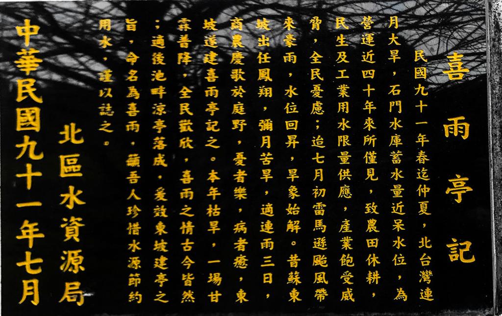 北苑公園除了有一大片草地之外,公園內建築採取中國庭園風,裡面有兩座涼亭:喜雨亭和惜水亭。1991年,北台灣連月大旱,石門水庫蓄水量接近呆水位,致農田休耕,民生及工業用水限量供應, 所幸有颱風雷馬遜帶來豪雨,水位回升,旱象才得以解除。仿效昔日蘇東坡在乾旱彌月後逢雨的喜悅,建喜雨亭紀念的心情,將涼亭命名喜雨,也籲國人珍惜水源,節約用水。公園內的廁所也採中國庭園建築,美輪美奐,被稱為五星級廁所。