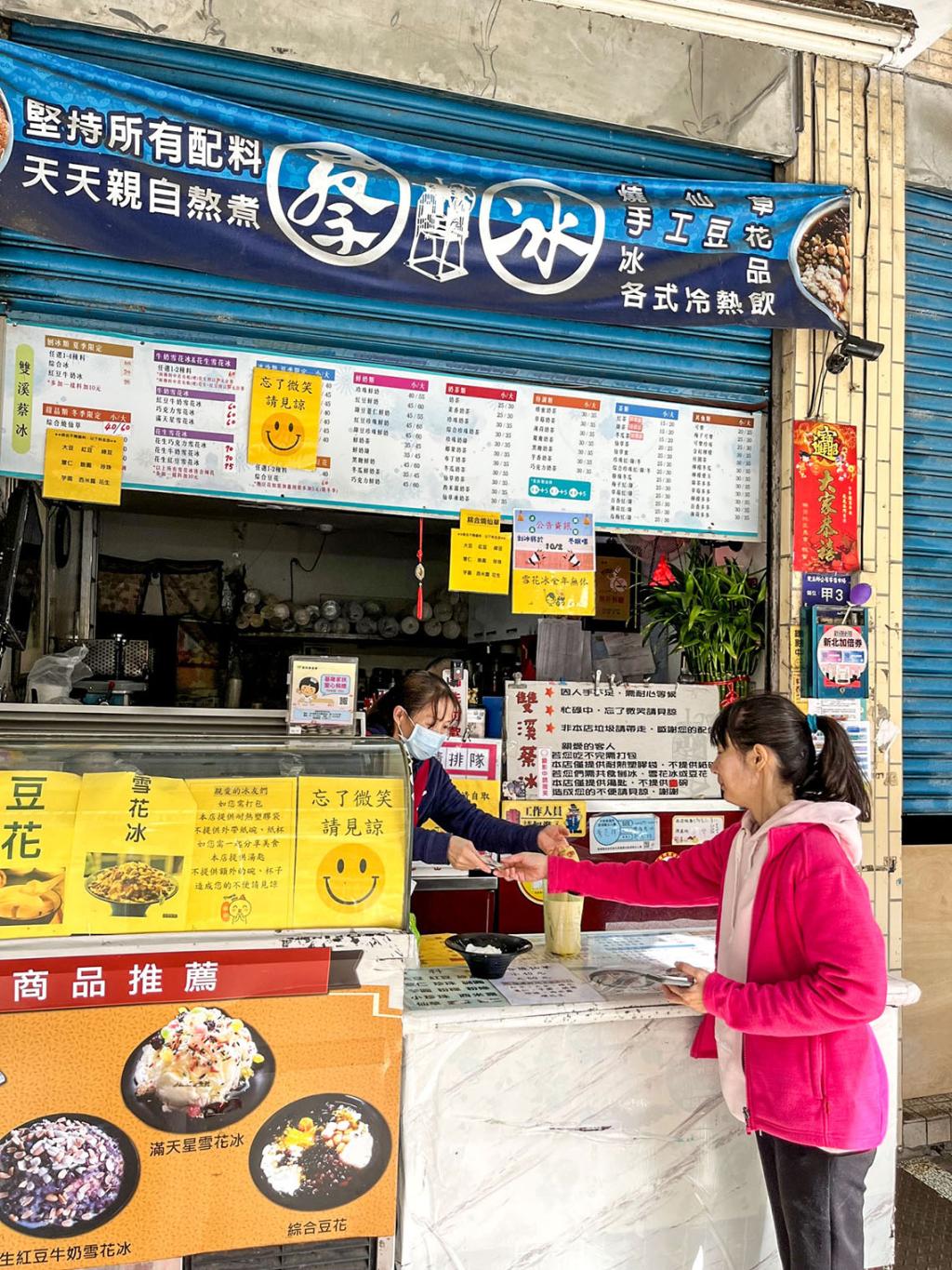 這家位於新北市雙溪市場裡的人氣冰品店,已經有超過40年的歷史了。蔡冰的特色是它的花生雪花冰,這是一種用花生冰磚刨出的細緻冰花,上面還加了牛奶花生和硬花生,讓你可以品嘗到不同的花生風味和口感。蔡冰的花生雪花冰非常受歡迎,每天都有很多人排隊等候,不管是登山客、自行車客還是當地居民,都會來這裡消暑解渴。除了花生雪花冰外,蔡冰還有其他的冰品和甜湯,如綜合冰、紅豆牛奶雪花冰、傳統手工豆花等,都是用新鮮的食材和傳統的手法製作,保留了雙溪的風味和文化。蔡冰的位置非常好找,就在雙溪公有市場一樓,面向大同街,斜對角就是三忠廟。