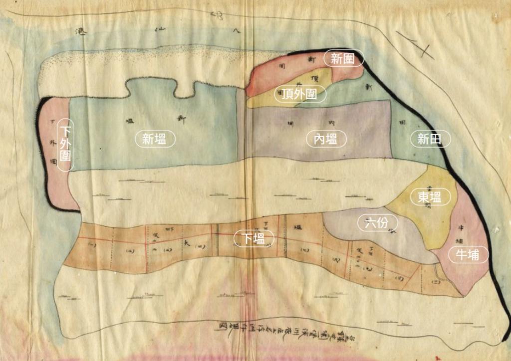 作為臨水沙洲,浮洲仔的拓墾伴隨共同體契約與工事。1772 年,十二人訂立直白嚴格的公約:面對南側蔡姓家族的侵佔威脅,眾人推舉代表赴官控告,以公費補償其耕作損失、盤纏與訴訟費;若有人無力出資須以土地抵押,延宕公事則「眾鳴共攻」。日常開發上,十二名耕作者合力築堤、開鑿內部水路;十個分區多以「塭」「圍」為名,顯示其工法近似圩田——外築提防圍地、引入洪水淤泥、阻鹽排水、改良土質。直至近二十年前,地方耆老仍記得「塭田」之稱;他們回憶,以前農人常在田邊排成一列,用鋤頭鏟土、堆成土圍擋水的情景。