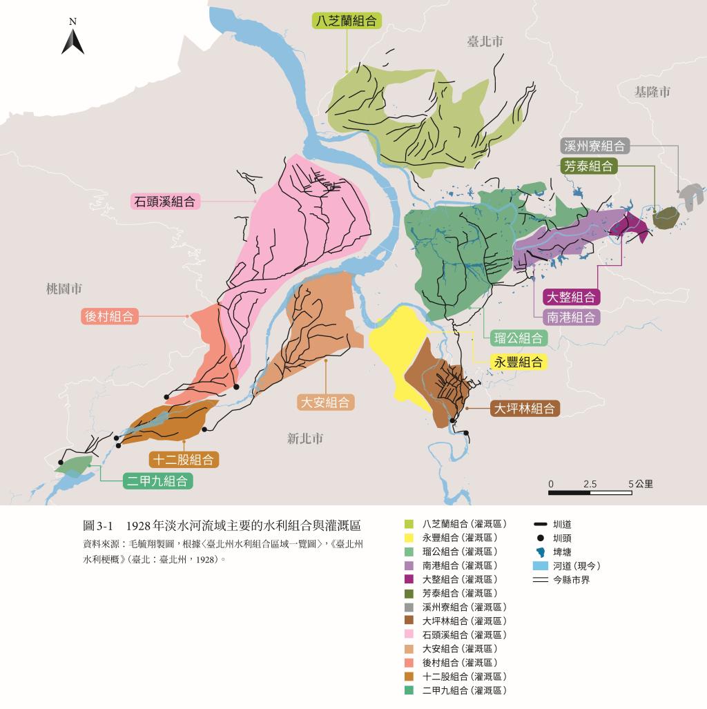淡水河由基隆河、大嵙崁溪與新店溪匯成扇形沖積平原,自清代以來,拓墾者以「埤塘蓄水、圳道引水」作為開發要領,沿各支流水系興築眾多水利設施。基隆河一帶有塭港圳、八仙圳、社子圳、十四份圳與若干小埤;大嵙崁溪與三峽河則分布永安、萬安、草埤、十二股、石頭溪、二甲九、南靖厝等圳;新店溪—霧裡薛溪(景美溪)水系亦孕育瑠公、大坪林、永豐、安坑與霧裡薛等圳。這套密布的「埤+圳」體系,將季節性、分散的水源轉為可控的生產力,為臺北平原的稻作與聚落擴張打下根基。