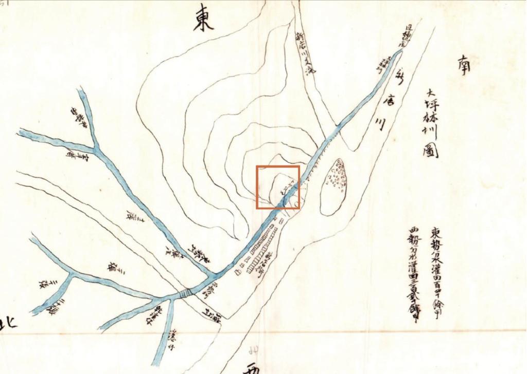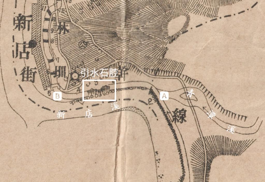 「引水石腔」是理解瑠公—大坪林圳選擇新店溪上游取水的關鍵現場。為了避開感潮段的鹹水與平原低地的洪氾風險,郭錫瑠評估後決定在青潭溪匯入新店溪處築壩,以堆砌石笱抬高水位,再把清水導入臺北平原。然而工程很快遇到兩大難題:其一,圳頭如何穩定取水;其二,幹線如何越過縱橫的霧裡薛溪。就第一個難題,郭錫瑠原本打算在新店溪右岸開挖一段與河道平行的明渠(圖3-4 A–B 段),卻被岸側天然石壁所阻,只能改以「鑿石成腔」的方式開築暗渠,於是便有了「引水石腔」的雛形。自乾隆五年(1740)抵達青潭口起,後續十二年,工程重點都卡在這道石壁上。