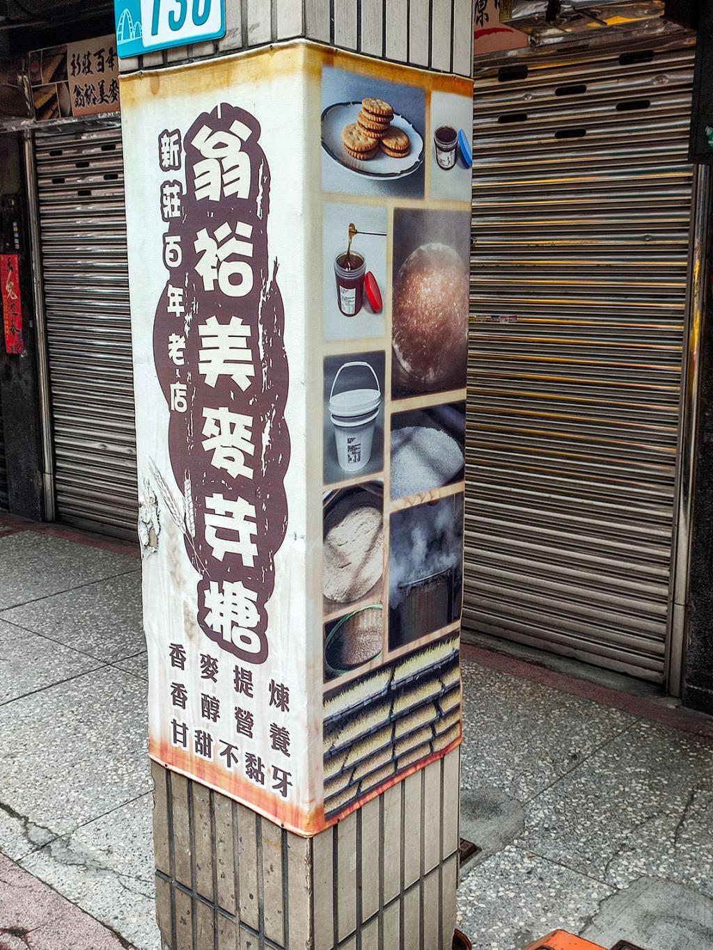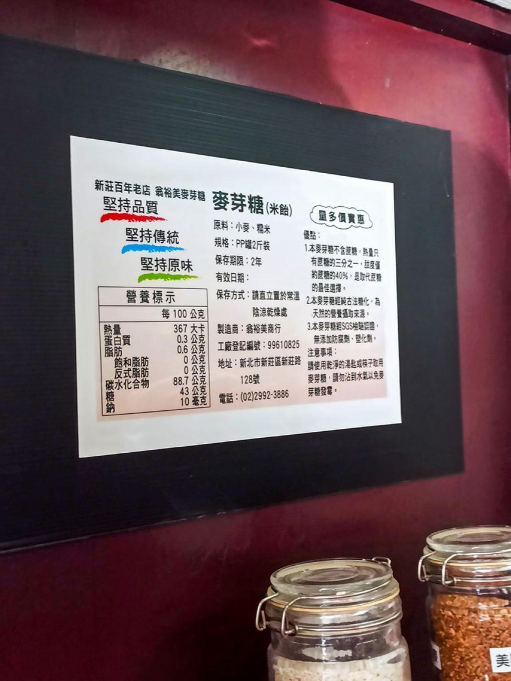 新莊麥芽糖的全盛時期在1950年代,當時曾有12家麥芽糖廠林立,然而由於經濟型態轉變、生產成本提高,糖廠逐漸外移、凋零,翁裕美商行是目前新莊老街上碩果僅存的麥芽糖商行,為翁成源先生創立於1901年,迄今已超過百年,現任經營者為其孫-統領百貨董事長翁俊治先生。