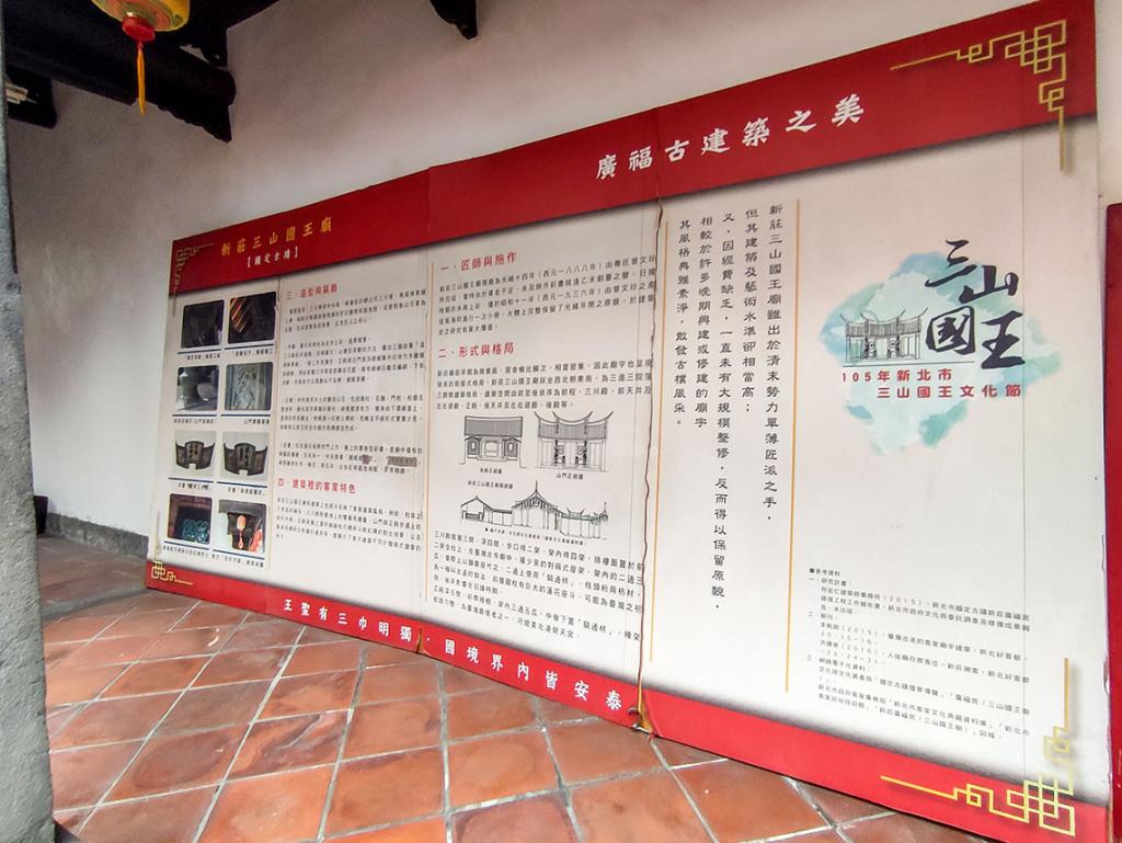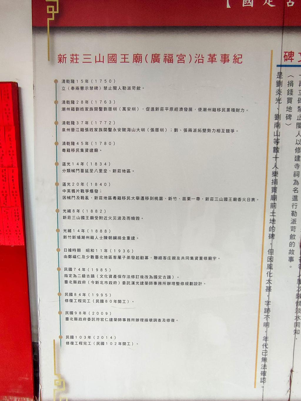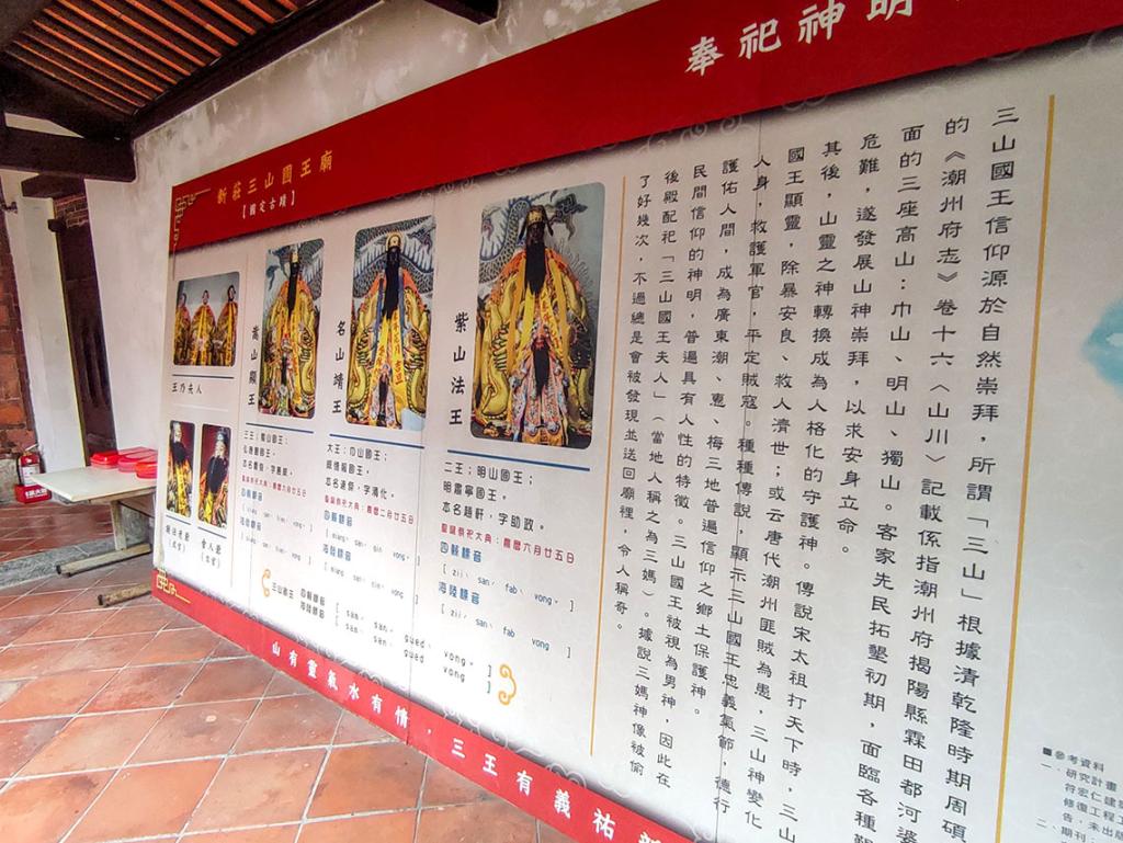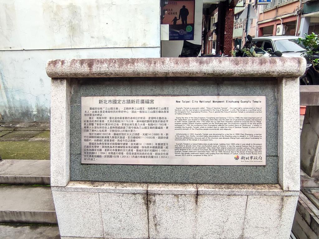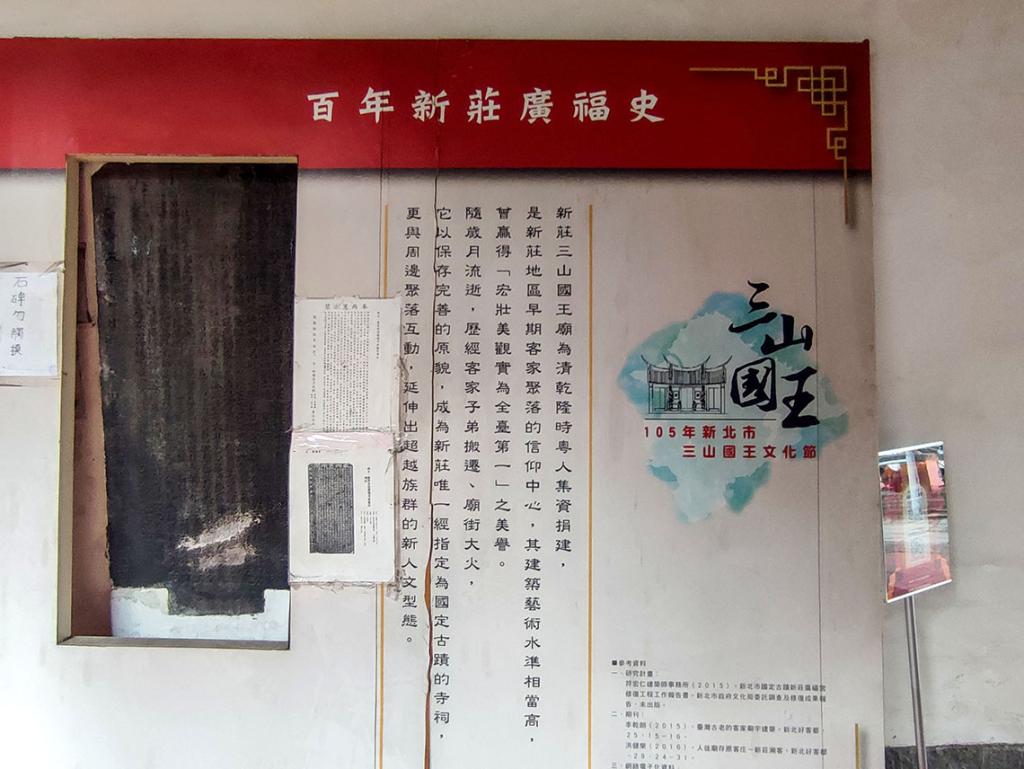 新莊三山國王廟(廣福宮)係乾隆45年(1780)粵人捐建,為北臺灣最早興建署客家人信仰的廟宇,見證新莊早期移民拓墾階段客家人的參與。廣福宮的興建,與潮州移民在新莊平原的開墾密切相關,其中劉氏家族於乾隆26年(1761)起開鑿了「劉厝圳」,使旱田變成水田,促進新莊的經濟發展。