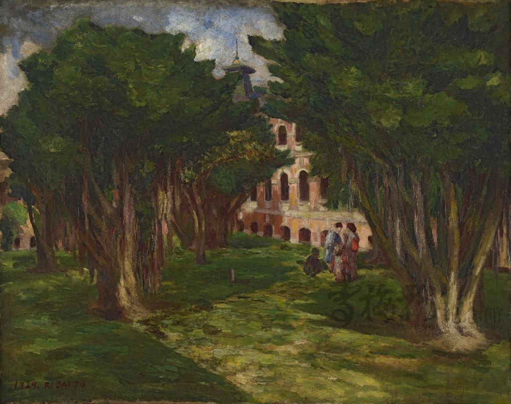 左右兩側高大的榕樹交錯豎立、盤根錯節,有著許多垂下的暗紅色氣根。在枝葉繁茂的榕樹之間,有一道未被遮掩的空隙,映照出ㄑ字形的小道。小道之上,有穿著和服的婦人或站或蹲著寒暄,為畫面添了一絲生氣。視線沿著小道向後望,有磚紅色外牆,牆上有橫排成三列的拱窗,最高處則可見醫院正面的高塔建築。
