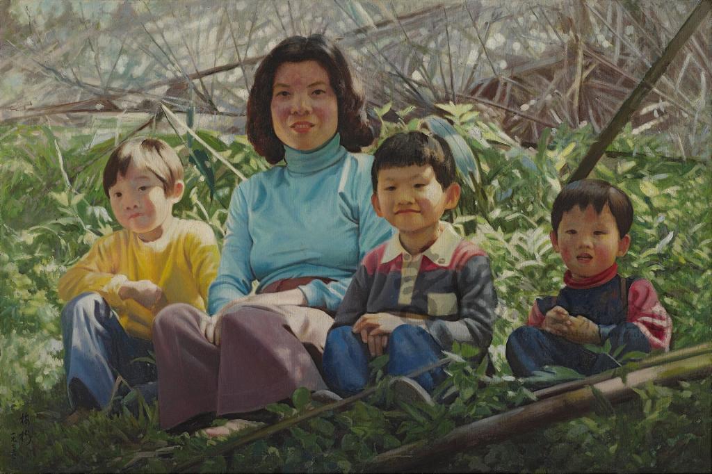 李梅樹在這幅作品中,巧妙地運用了光影效果,並且通過色彩的對比和細膩的光影變化,生動地描繪出一家人在自然環境中的和樂景象,展示了他高超的繪畫技法。