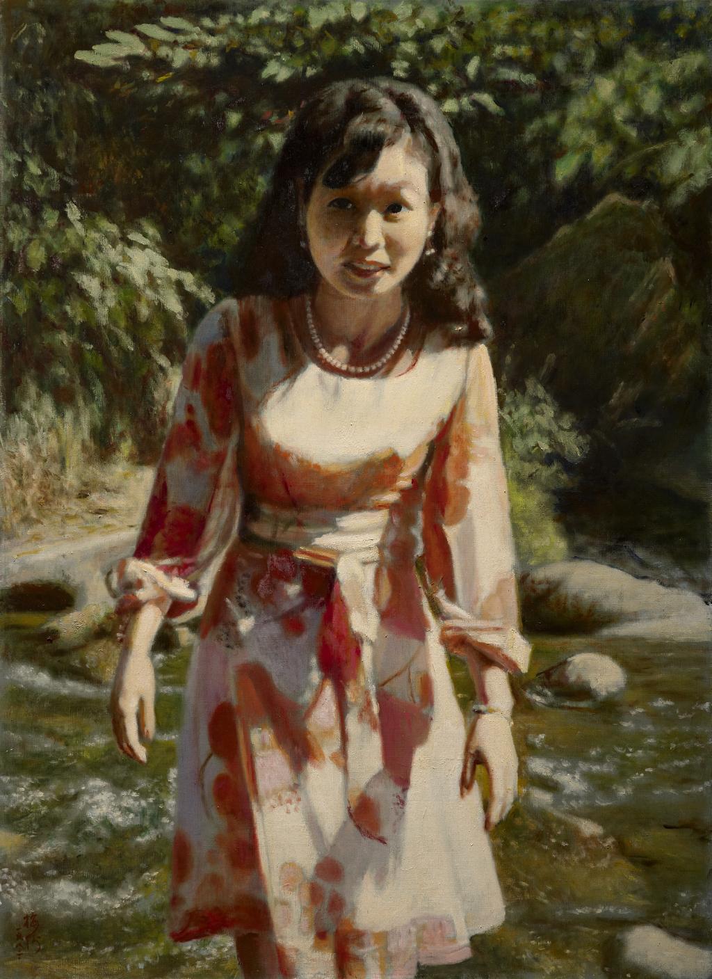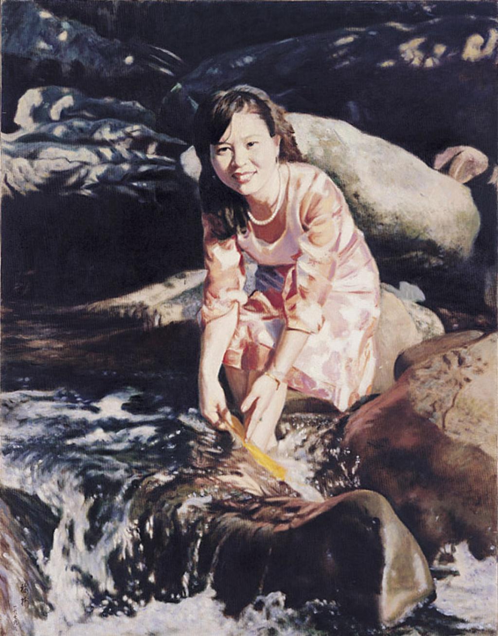 畫面主要展示了人物、石塊和溪水。畫中的光線和溪水表現得非常寫實自然。人物左臉上有明顯的陽光照射,右臉則呈現陰影。石塊上的光影變化多端,上方的石塊有樹木的陰影,而人物背後的石塊則在陽光直射下顯得明亮乾燥。溪水中充滿了水花,展現出流動的動感,石塊下的水流紋路也透過明暗變化清晰可見。