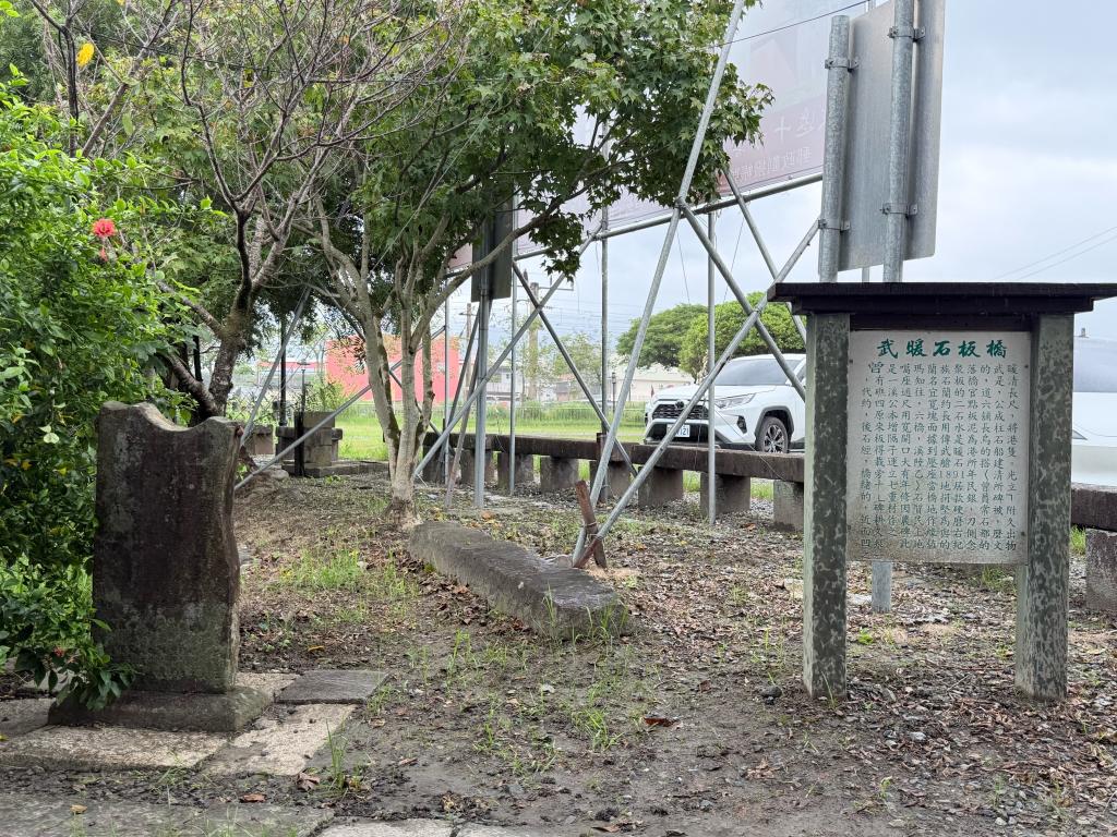 建造於清領時期光緒17年這座橋是五條石板舖設的,長約4公尺、寬約2.6公尺,石板與石板間是以榫接方式相銜接而成。傳係武暖石板橋為長條石板舖成,相傳石材來自壓艙石,武暖石板橋是因武暖港而得名,古人可從武暖港乘舟經三十九結,連接二龍河出海。在橋的東北端有座福德廟供奉福德正神,吳沙氏族開蘭之初所供奉的。廟旁更有一棵榕樹,不時會看見居民在樹下聊天乘涼,另外在橋旁立有「重修石橋捐題碑」,目前但見碑額頂端凹彎,是當地作穡人為利刀割禾所磨畫出的。