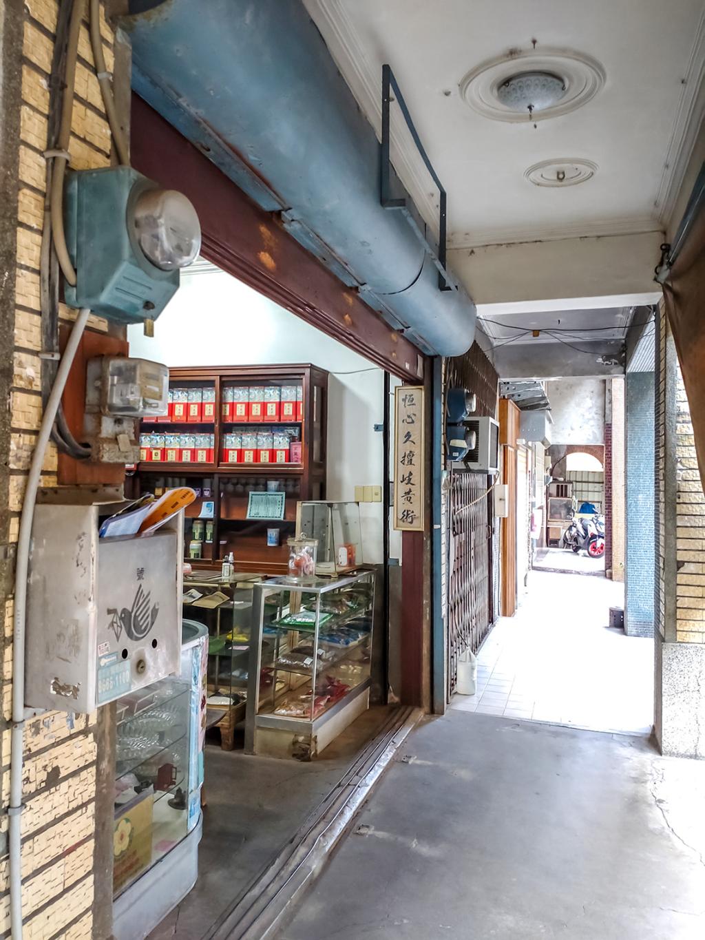 進入店裡,首先看到懸掛於兩旁的對聯:「恆心久擅岐黃術,德澤長生桔杏春」,昔時的大紅紙在時光推移下也已褪成泛白。店裡兩側分別擺放不同年代的中藥櫃,早期的進口人蔘鐵罐,散發著舊年代的養生味道;明亮的中藥白瓷瓶,依然承裝著救人濟世的慈悲心腸;店內兩張大而寬的長板凳,可以見到店家體貼來訪民眾的心意,板凳上放著一張切削藥材的切刀臺,厚約10公分的底板,黑得發亮,吸附著百年來的甘甜滋味;一旁約4尺高、7尺長的百年木櫃,右方一角凹下一圈深深的圓孔,是歷代主人為客人以銅缽捶製藥品的真實見證。