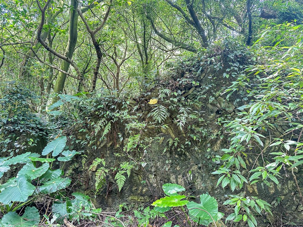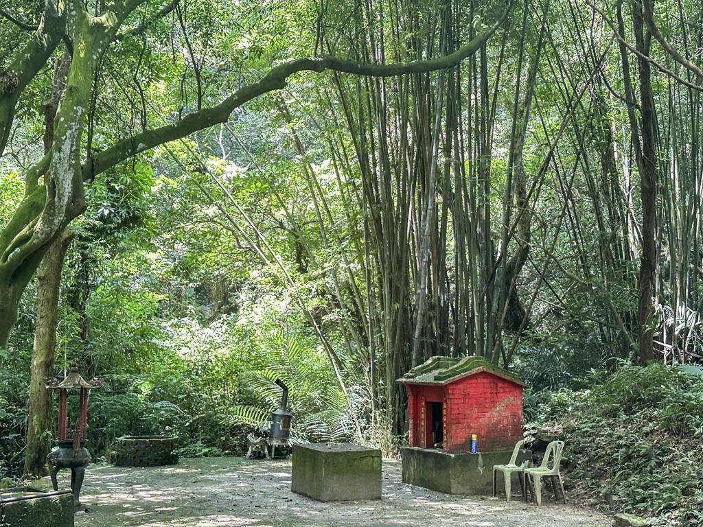 步道全長不到900公尺,為福源山步道的支線,入口海拔約200公尺,起步是一段緩坡向上的枕木階梯,右上方有片綠意盎然的岩壁,觀音座蓮、姑婆芋、水同木等長滿山谷。枕木階梯緊接著接上原始土路山徑,兩旁林木蓊鬱,菲律賓榕、森氏紅淡比、相思樹、香楠等大樹以及臺灣山桂花、華八仙、九節木等灌木,形成茂密森林。未幾右邊出現一棟廢棄斑駁僅餘石砌牆壁的房屋,牆上長滿爬藤和蕨類植物。不久左邊出現一片綠竹林,右邊是一塊平整的水泥地,其中有座簡單古樸的小土地公廟,底座與屋頂是水泥,廟身由磚塊堆砌,刷上紅漆,廟門兩旁寫有對聯「福德鎮山保萬民」、「神威顯福賜敬人」。