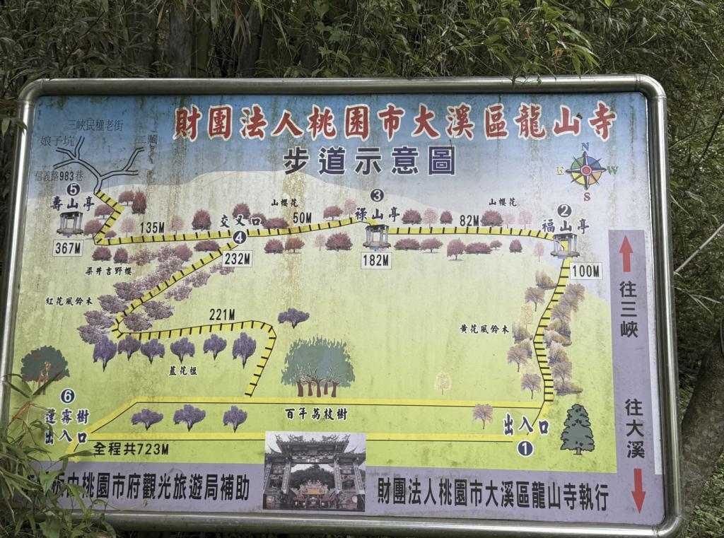 寺廟後方拾階而上,可見六株逾150年的老荔枝樹,係黃龍安昆仲當年自福建泉州引進,藉以寄託對故鄉思念之情。後山昔日的分水崙古戰場,今已闢建環山步道,設有福、祿、壽三座涼亭,林木蓊鬱,山徑蜿蜒,眺望層巒疊翠與鴻禧山莊,盡顯大溪絶美風光。 參考文獻:永福風華/龍山翠微(謝維修編撰)