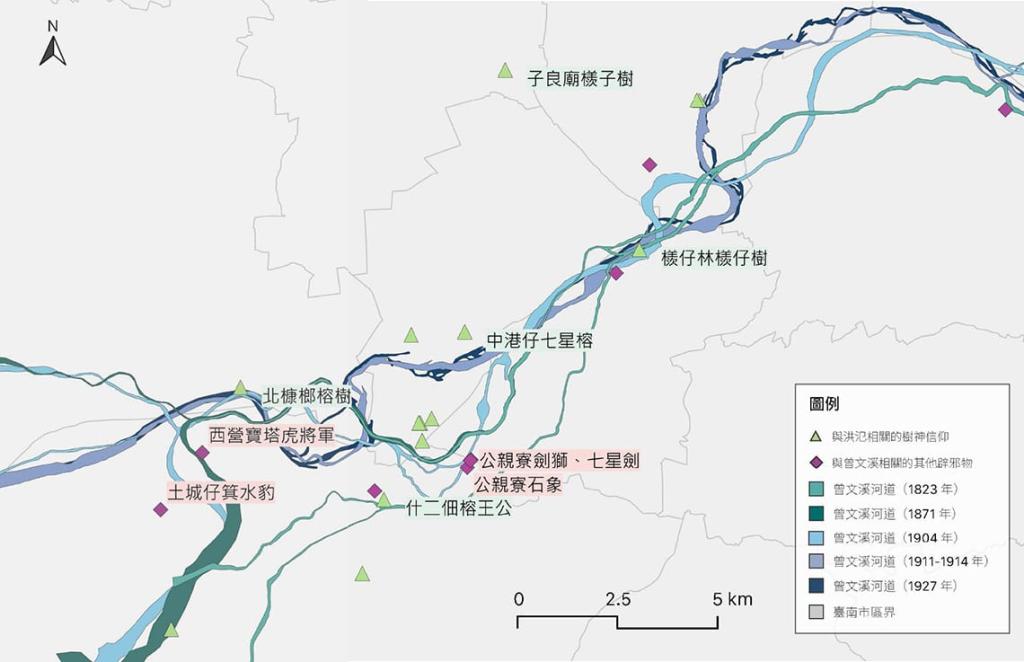 以樹神來辟邪,取的是植物旺盛的生命力,尤其生長快速、抓地力強的榕樹,是溪畔最普遍的辟邪物。如果以科學角度來看,水利人員所周知的曼寧公式可以解釋這些作為。在溪邊種樹雖不大可能具有將河水撥到對岸的挑流作用,但植生至少能造成阻力係數曼寧n值增大,削減洪流能量,達到緩和水流的目的。事實上,以植樹固堤護岸的知識是行之數千年的古老智慧。曾文溪畔的史實告訴我們,栽植榕樹、檨子樹、林投樹等,早已是溪畔的居民用以減緩土地流失或保護聚落的地方知識。