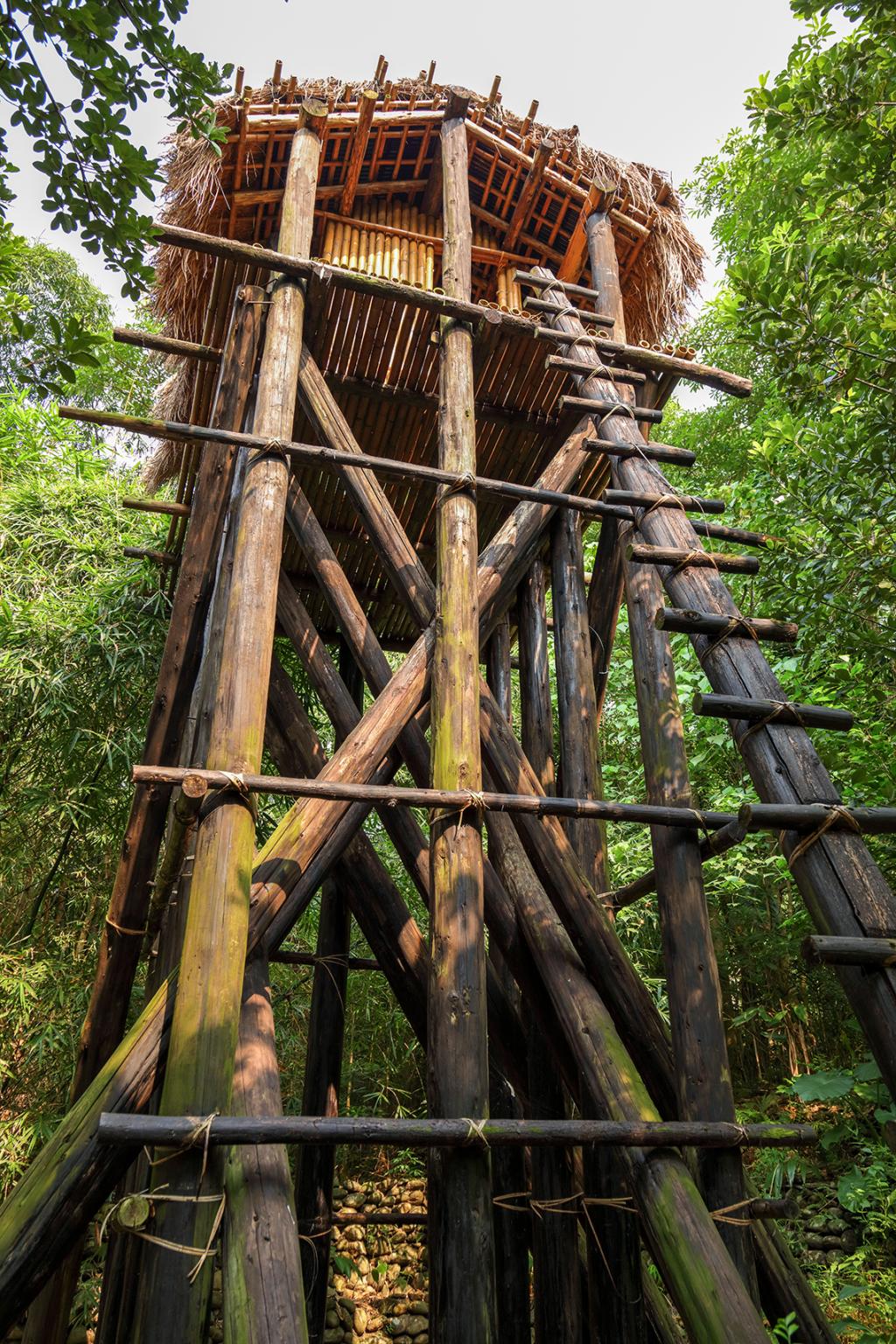 The watchtower is an elevated wooden building, erected by dozens of logs. There is a narrow space above the watchtower for look-out. It is located at the entrance or center of the tribe. It is used for defense and surveillance. Later it evolved into a place for leisure or for couples to date.