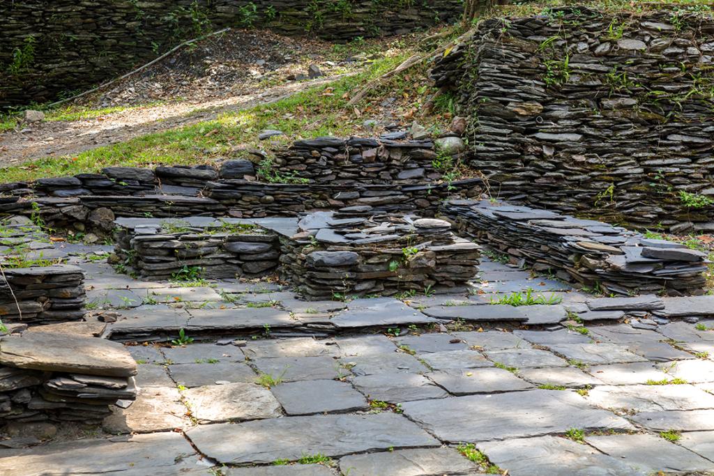 一是石板建造,無論牆砌、庭院、屋頂全使用石材。