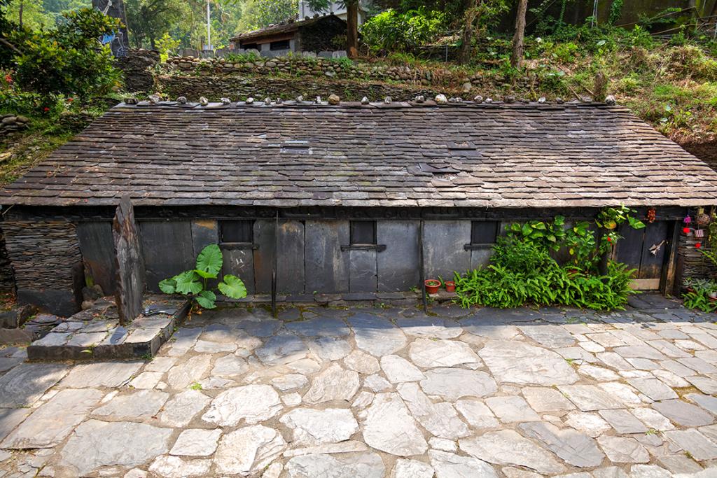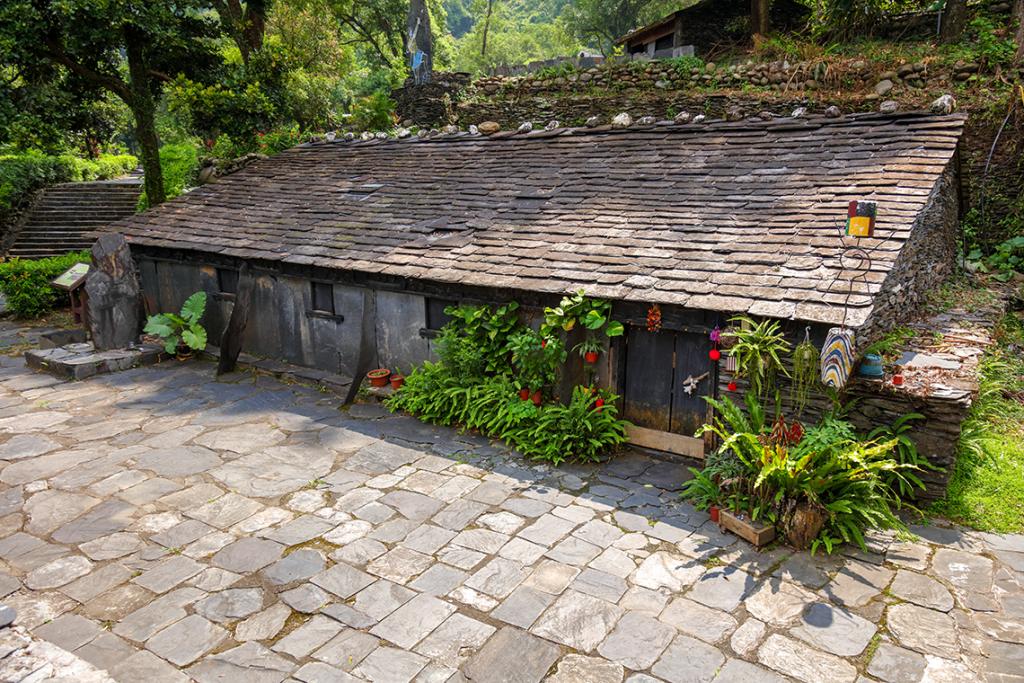 This reconstructed building shows the traditional house of the chief. A chief’s house always has a stone pillar in the center of a wide courtyard. The main house is horizontal, made of slate, and has the entrance on the left. There are no partitions inside the house, the windows on the front facilitate lighting, and the wood carvings under the eaves and on the columns inside the house are symbols of a noble’s house.