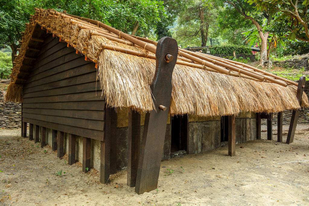The materials used on the chief’s house are the same as the commoners’ houses. The only difference is the space size. The interior is divided into front and rear parts. There are two entrances and upon entering the house, there is a wall hung with boar skulls, and beds on both sides of the wall. At the rear end of the house, there is a large grain storage.