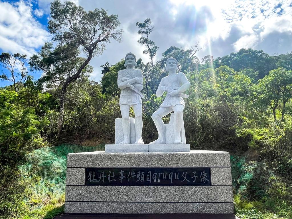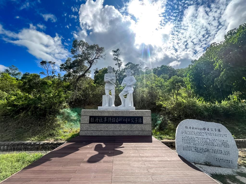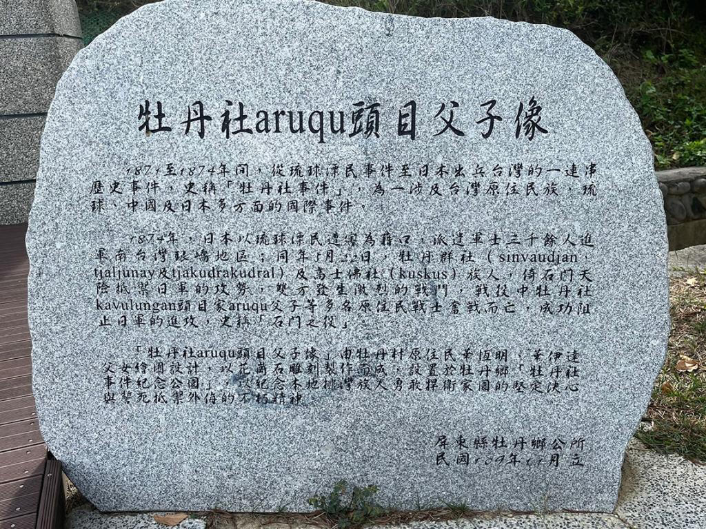 「牡丹社aruqu頭目父子像」由牡丹村原住民華恆明、華伊達父女繪圖設計,以花崗石雕刻製作而成,設置於牡丹鄉「牡丹社事件紀念公園」,以紀念本地排灣族人勇敢捍衛家園的堅定決心與誓死抵禦外侮的不朽精神。